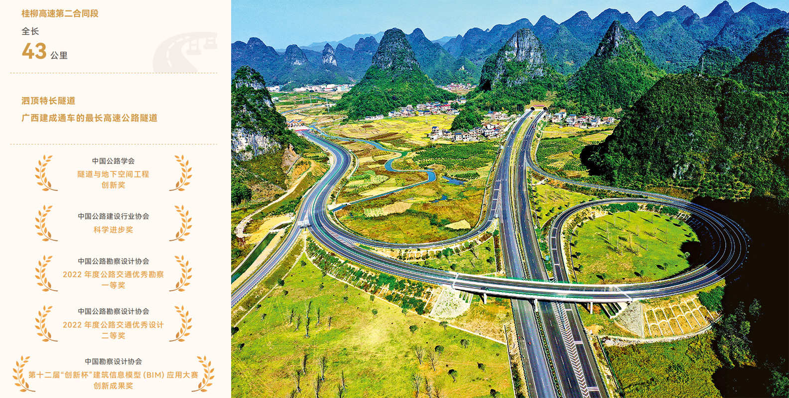 桂柳高速第二合同段(桂林市古豪村至柳州市融安縣紅嶺村段)全長 42.895 公里,其中泗頂特長隧道是目前廣西建成通車的最長高速公路隧道,也是廣西第一個(gè)設(shè)置斜井的高速公路隧道。該項(xiàng)目路段地質(zhì)條件復(fù)雜,泗頂特長隧道隧址為典型的巖溶峰叢地貌,隧址區(qū)內(nèi)地下水豐富,巖溶裂隙發(fā)育,巖體破碎,是全線隧道克難攻堅(jiān)戰(zhàn)中最重要的“卡脖子”工程。公司進(jìn)行多方案比選論證,組織專家團(tuán)隊(duì)現(xiàn)場勘察,并進(jìn)行多次評審論證,在前期設(shè)計(jì)階段有效繞開了溶洞、地下暗河等不良地質(zhì),高質(zhì)量完成了設(shè)計(jì)任務(wù);在隧道施工過程中,組織技術(shù)骨干成立設(shè)計(jì)代表組,長期駐守施工現(xiàn)場,及時(shí)解決和指導(dǎo)施工過程中遇到的問題,解決多次大型巖溶突水事件,為隧道順利貫通提供技術(shù)保障。