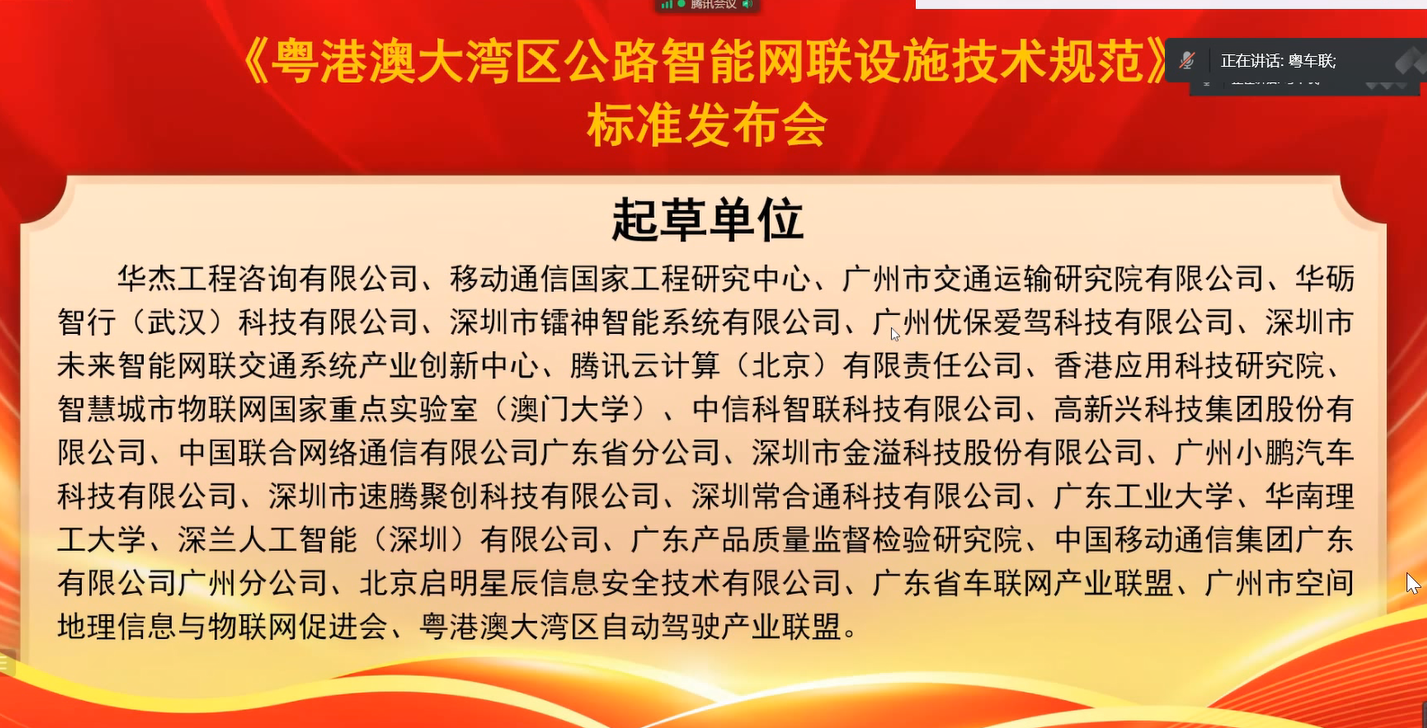 2022年12月30日,《粵港澳大灣區(qū)公路智能網(wǎng)聯(lián)設(shè)施技術(shù)規(guī)范》在國家團體標(biāo)準(zhǔn)信息服務(wù)平臺發(fā)布,公司作為規(guī)范編制組總體單位參加線上標(biāo)準(zhǔn)發(fā)布儀式,公司副總工鐘小明代表編制組發(fā)言,編制組成員賈嘉、張健、李瑞美、其他編制單位代表及新聞媒體代表約80人出席發(fā)布會。