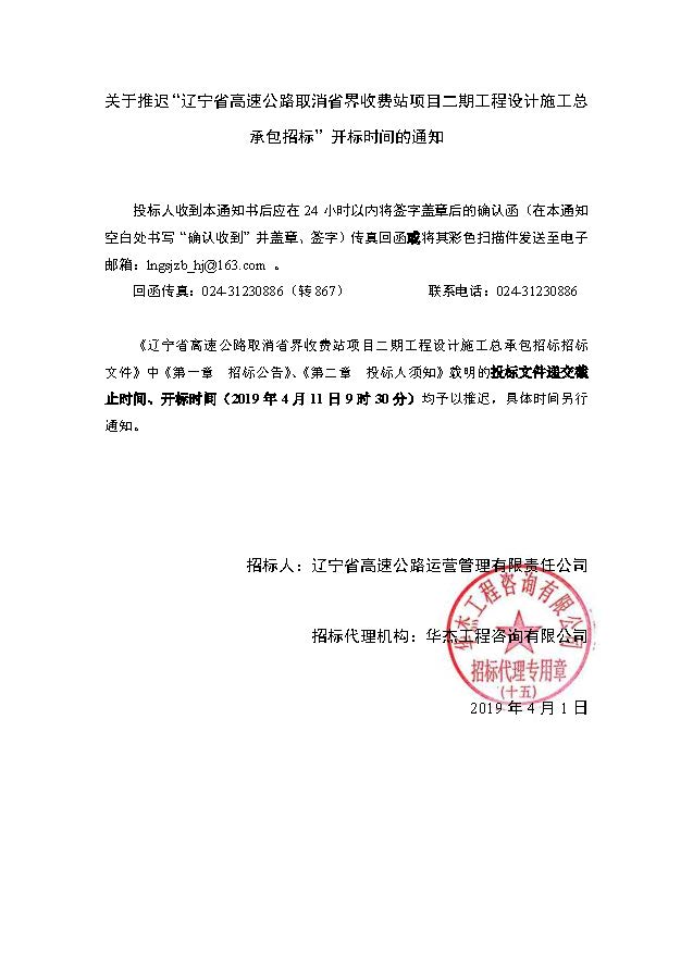 遼寧省高速公路取消省界收費(fèi)站項(xiàng)目二期工程設(shè)計(jì)施工總承包招標(biāo)——推遲開標(biāo)時(shí)間的通知(2019-4-1)
